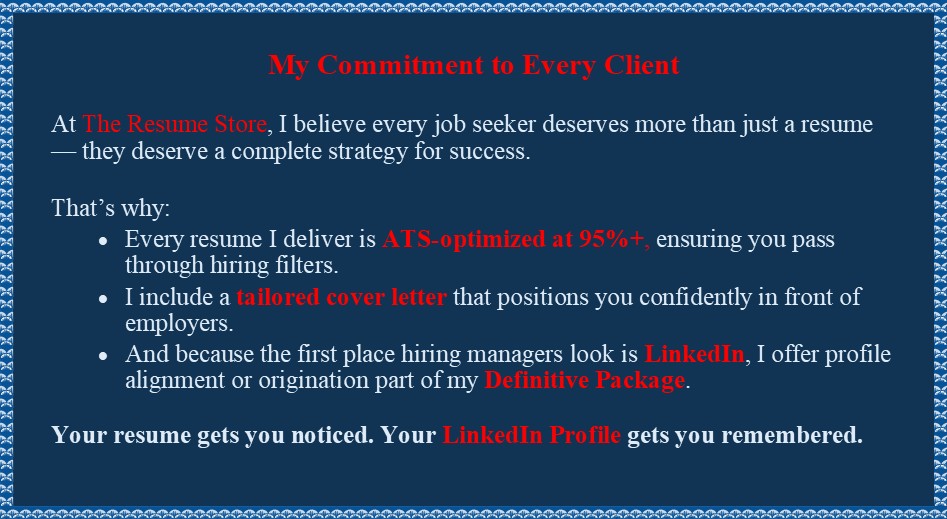 With over 25 years of experience perfecting resumes, cover letters, and LinkedIn profiles, my passion for helping individuals stand out in today’s competitive job market remains as strong as ever. I specialize in creating documents that are not only tailored to your unique qualifications but also designed to seamlessly navigate Applicant Tracking Systems (ATS).